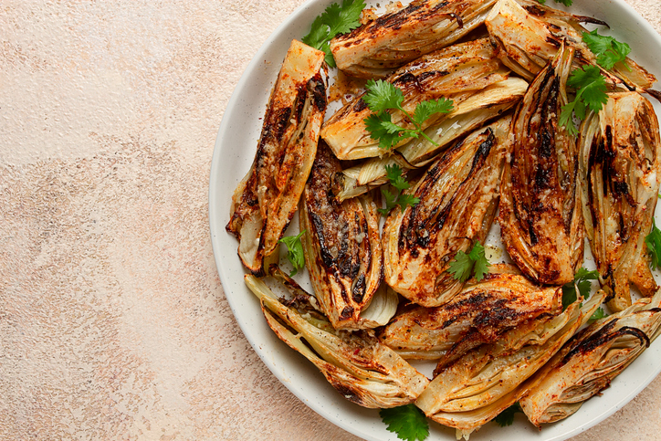 Нарязаният, печен на скара фенхел се превръща в чудесна салата с дресинг от маслини, магданоз, босилек и чесън.