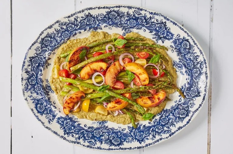 Тази салата съчетава печени на барбекю нектарини и аспержи със сос Ромеско. Сосът е с пушен, остър и приятно горчив вкус, който допринася за комплексността на ястието.