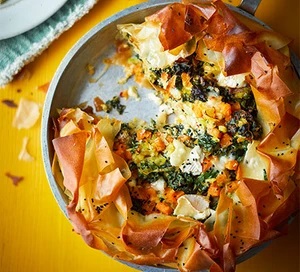 4. Поставете тигана върху котлона, на умерен огън, за 3 минути, за да се запече отдолу. След това прехвърлете в предварително загрята фурна на 200 градуса (с вентилатор) и печете 12-15 минути. Оставете пая да изстине за 10 минути преди да го нарежете и да го поднесете със зелена салата.