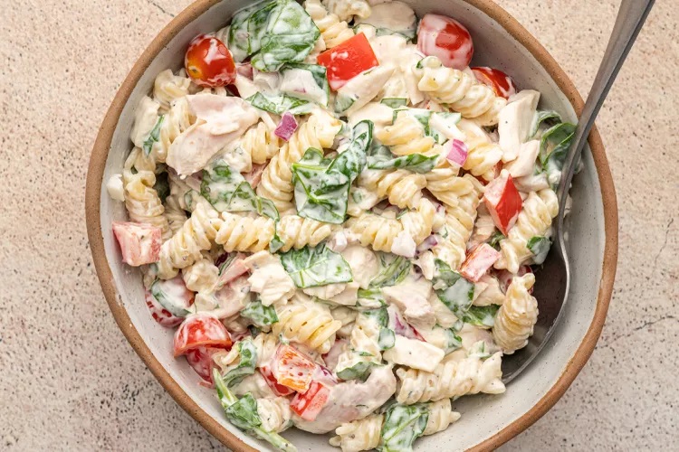 Изпратете на училище детето си с тази салата с паста, пилешко месо, спанак, домати и други хрупкави зеленчуци. Може да използвате останало печено пилешко месо или месо от консерва. Рецептата е много адаптивна, така че добавете продукти, които детето ви обича.