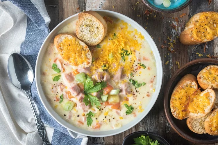 Тази крем супа с шунка е все едно да ядете печен пълнен картоф в купа. Напълнете термосите на децата с тази супа, която заедно с шепа крекери ще се превърне в чудесен обяд за училище, особено в по-студените дни. Супата е пълна със зеленчуци, а съдържа и протеини под формата на шунка. Може да я приготвите както на котлон, така и в уред за бавно готвене.