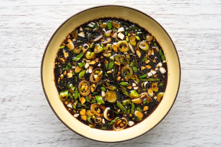 1. В купа смесете всички продукти – соевия сос, водата, кафявата захар, оцета, олиото, смачкания с преса чесън и нарязания на тънки кръгчета пресен лук. Разбъркайте доре, докато захарта се разтопи.